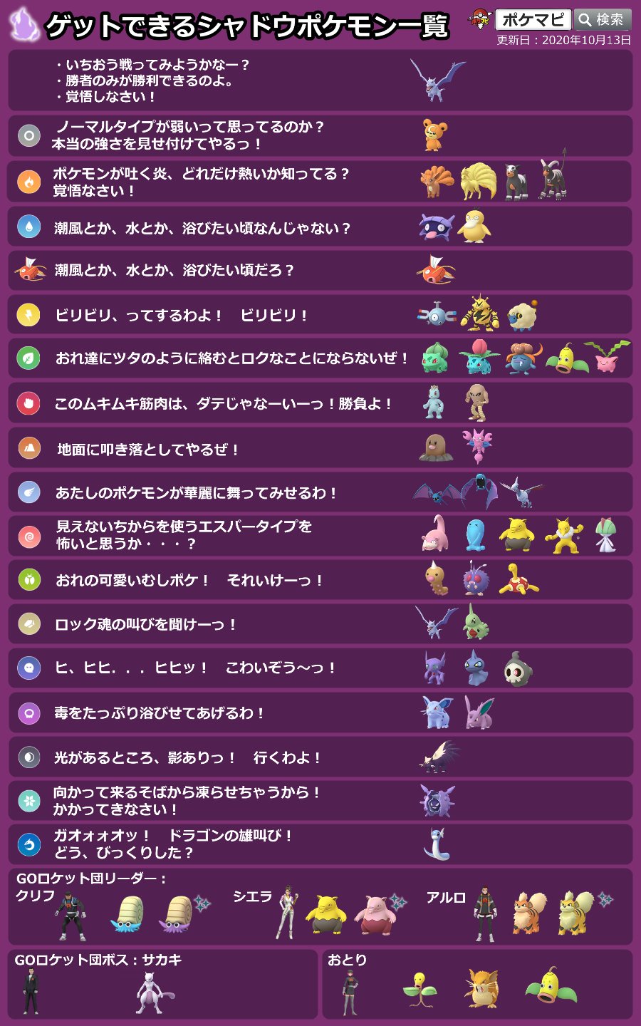 ポケモンgo攻略情報 ポケマピ Twitter પર ゲットできるシャドウポケモン一覧 画像は保存やシェアしてご活用ください Goロケット団の使用ポケモン変更 気球10 13 火 朝5時 ポケストップ10 14 水 Goロケット団のセリフ別使用ポケモン 対策ポケモン一覧は
